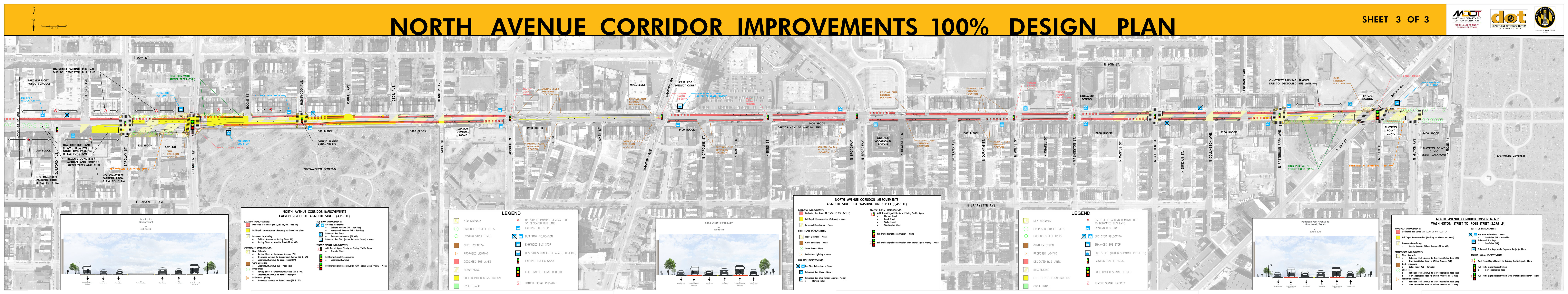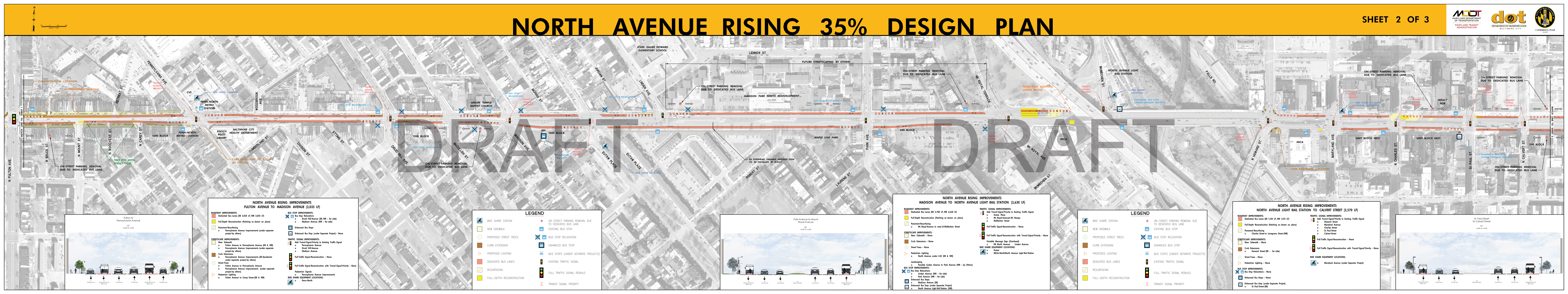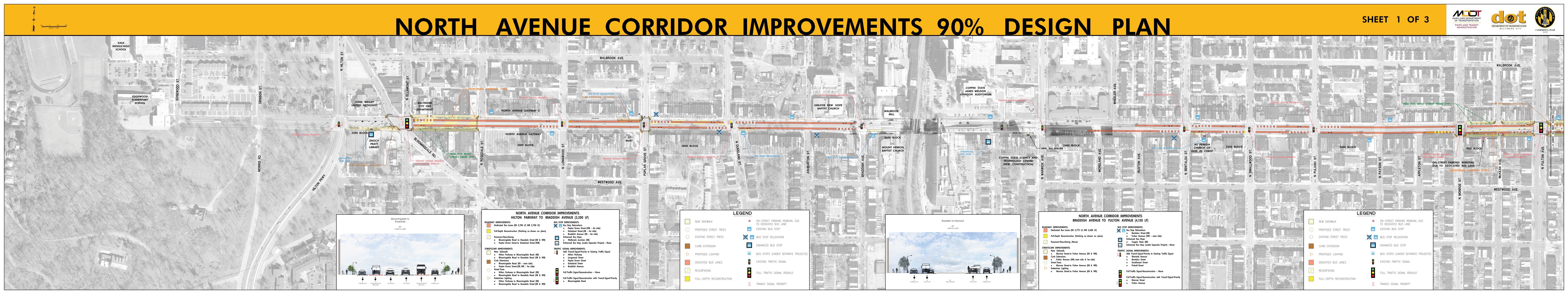 The Roll Maps included below reflect the advertised design plans for both the Corridor and Penn North Intersection Sub-Projects of North Avenue Rising. These include some refinements from feedback to the designs that were presented at the September 2018 Public Meetings.