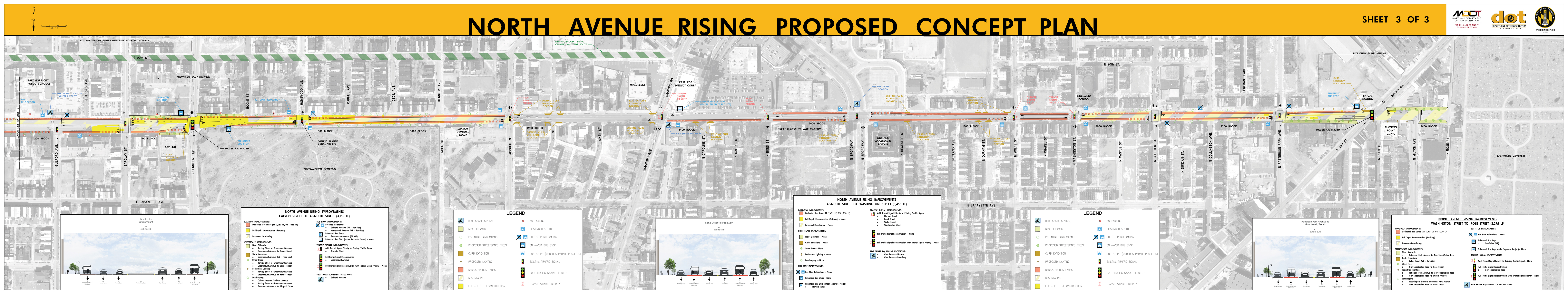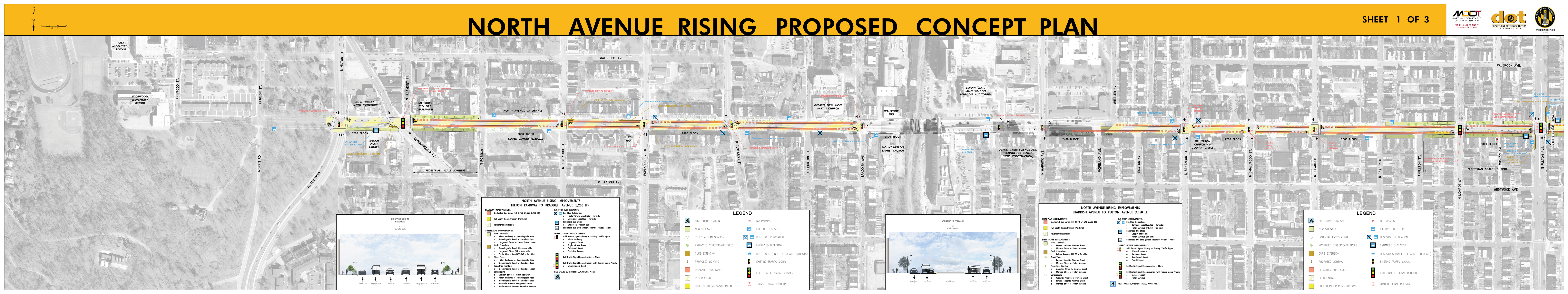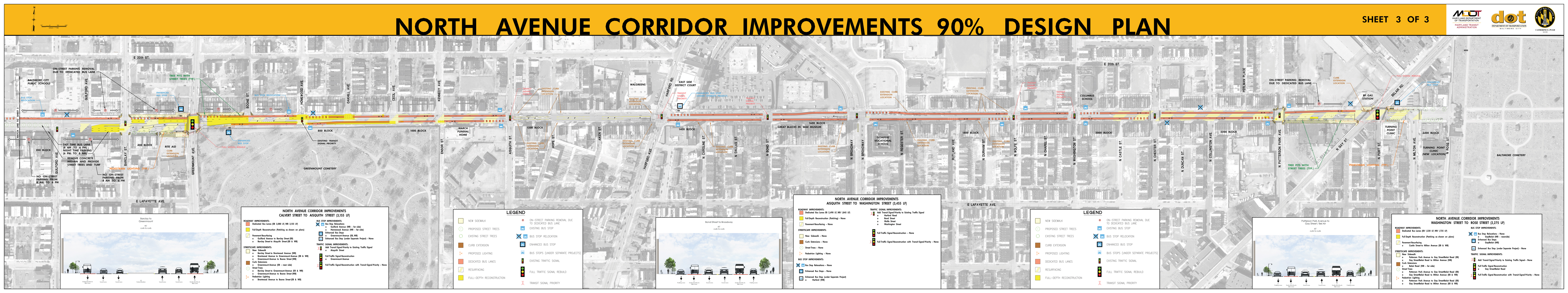 The Roll Maps included below reflect the advertised design plans for both the Corridor and Penn North Intersection Sub-Projects of North Avenue Rising. These include some refinements from feedback to the designs that were presented at the September 2018 Public Meetings.