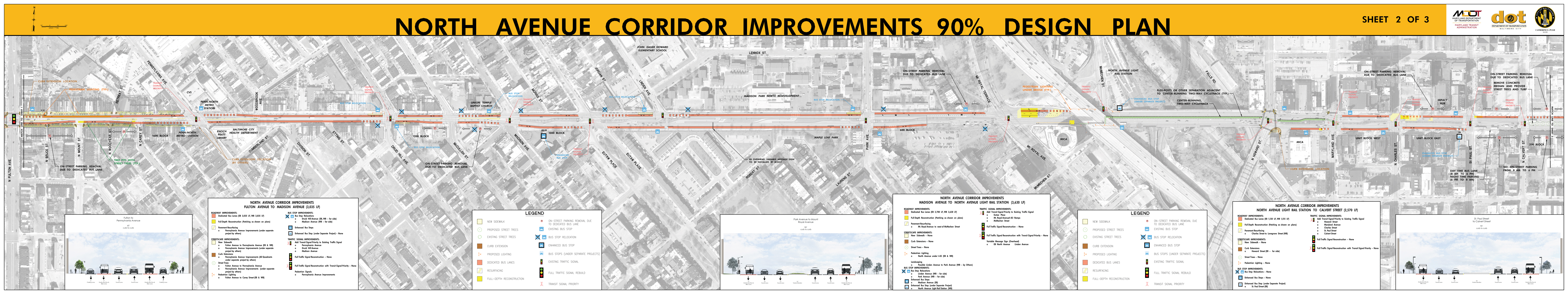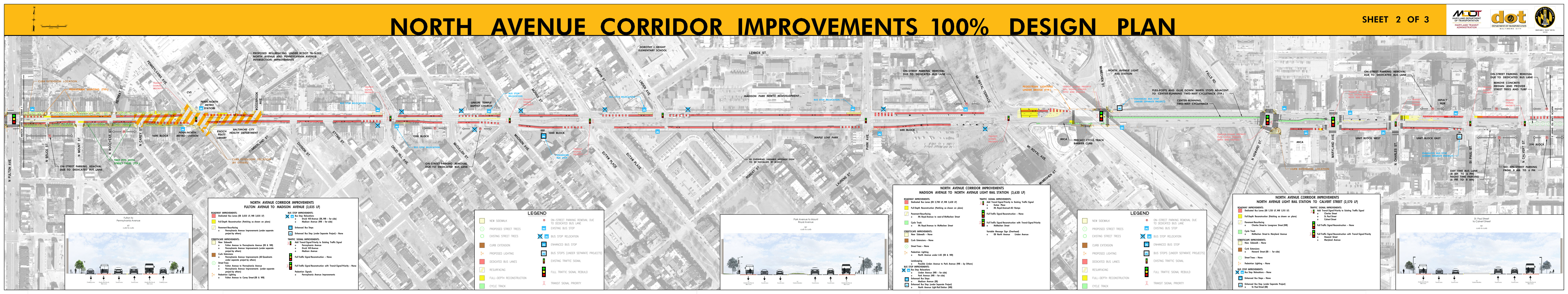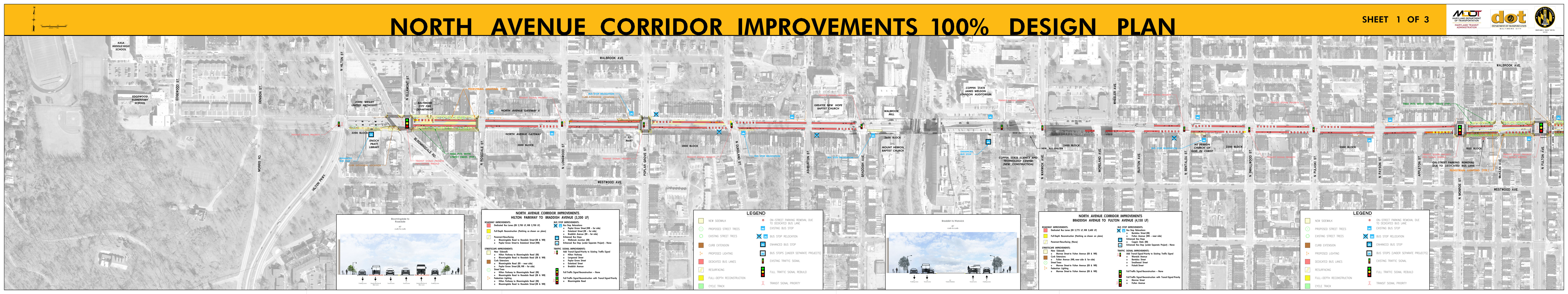 The Roll Maps included below reflect the advertised design plans for both the Corridor and Penn North Intersection Sub-Projects of North Avenue Rising. These include some refinements from feedback to the designs that were presented at the September 2018 Public Meetings.