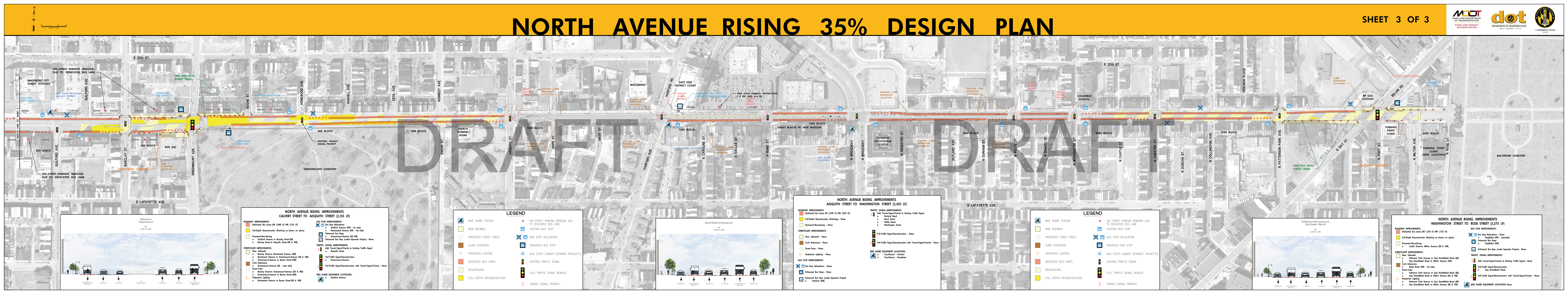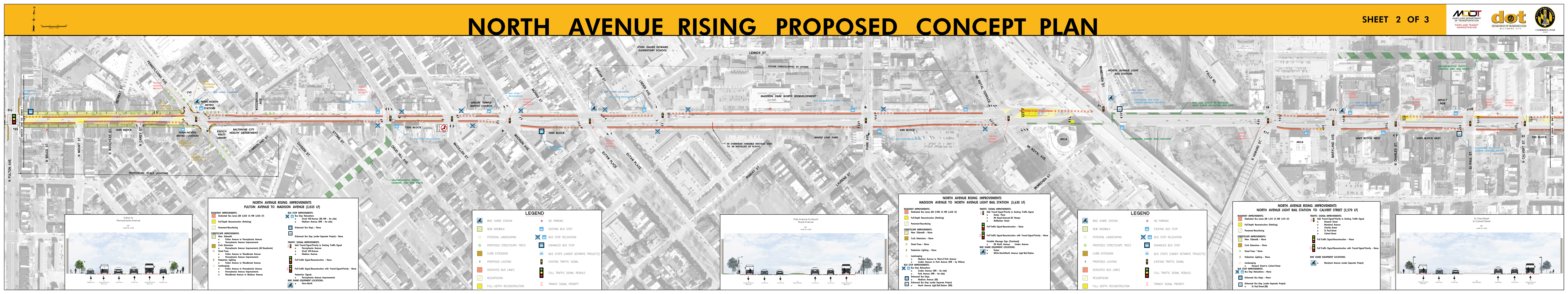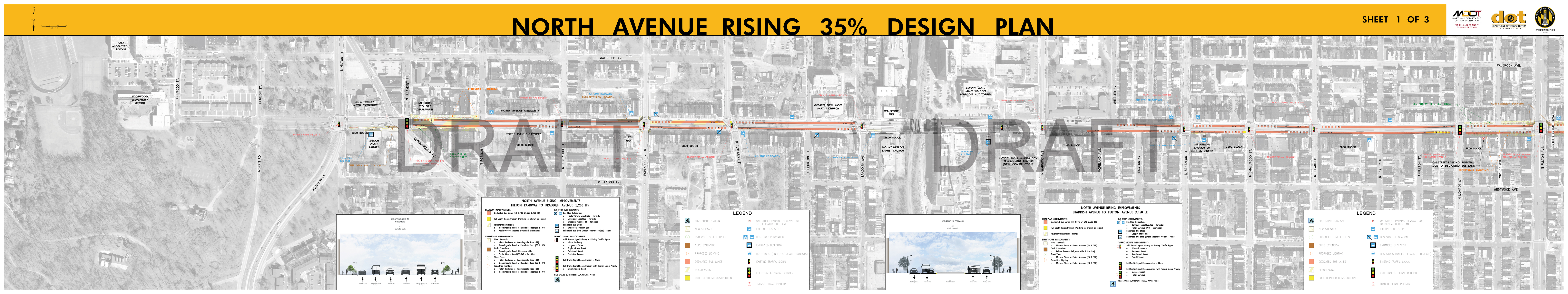 The Roll Maps included below reflect the advertised design plans for both the Corridor and Penn North Intersection Sub-Projects of North Avenue Rising. These include some refinements from feedback to the designs that were presented at the September 2018 Public Meetings.